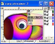 ![]() 【図17】 作例では胴体部分にパターンを加えていますが、このような場合は、胴体の複製を同じ位置に作成し、複製のブクラデーション塗りをパターンに変更するのが効率的です。その為には胴体部分を選択後、編集メニューの【コピー】にてメモリーに読み込んでから新規レイヤーを作成し、作業領域をそこに移動してから編集メニューの【前面にコピー】を実行するとまったく同じ位置にペーストすることが出来ます。 |