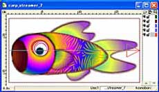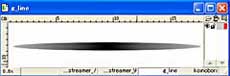 ![]() 【図21】 竹竿に鯉のぼりが括られているイメージを演出するために紐のイメージを作成してみることにしました。ただし作業は簡単です。図のように扁平の楕円を作図し白から黒、そして白という流れのグラデーションを指定してスケルタルストケークとして登録するだけです。このストロークを透明度を 調整させることで白と黒の部分が強弱となり、あたかも紐に括られているようなイメージを得る事が出来ます。 |
