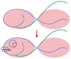 ![]() 【図03】 2つのカーブを描いたところで【図03】のように尾ひれに該当する部分のカーブを微修正させます。決まりはありませんが、なんとなく金魚の尾ひれを連想してみてください。次に唇と目を描きます。 ※唇の部分の滴形の作成方法については【図09】~【図12】を参照してください。 |