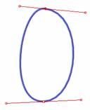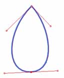 ![]() 【図12】 作図も【図11】の状態になれば完成したのも同様です。あとは【図12】のようにハンドルの片方をパスの内側に移動させれば唇になります。必要に応じてこの段階でノードを追加したり、滴の先端となる丸い部分のハンドルを調整してみましょう。 |