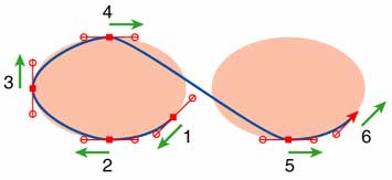 ![]() 【図07】 作例のようなS字カーブを作成する場合、【図07】のように順番に下絵となる楕円の垂直・水平の対角線上にノードを作成するような気持ちで描き進めましょう。この時ハンドルは必要以上に大きく伸ばさないほうが後処理が楽です。パスはハンドル調整でいつでも自由に調整できるからです。神経はノードの作成だけに集中させましょう。 ※必ずしもこの方向の通に描かなくてはいけないと言うことではありません。 ※パスの構造については連載第一回目の【図04】を参照してください。 |