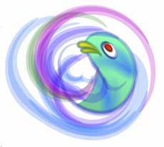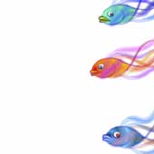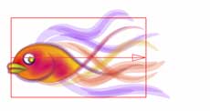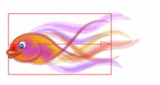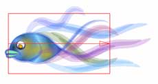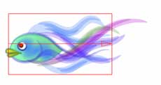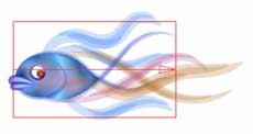 | 【図27】の状態を元に6種類のパターンを作成してみました。作り方は、まず【図27】をストローク登録し、それを呼び出して修正後にリネームしてから保存という流れを繰り返します。登録したものを何度も納得のいくまで修正することが出来るので全体の流れの中で最後まで修正を続けてしまいました。 | 手順としてはまず【図28】~【図30】を作成し、そのバリエーションとして【図31】~【図33】を作成しています。微妙に尾ヒレや背ビレが違っているのがお解り頂けるでしょうか。 | 6つのバリエーションを作成する過程で、唇の動きと目の動きを調整しているうちに目の大きさが大きすぎると判断し、半分近く縮小しています。これは実際に最終段階のレイアウトを行っている最中に処理しています。最終段階のレイアウトはいつも重要です。 | ||