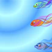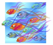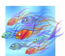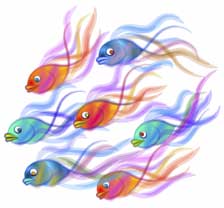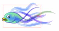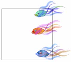 ![]() 【図46】 【図45】の上に最初の7匹の金魚を配置した状態です。この状態から微修正下物を完成としています。ですから次のページの完成イメージとは若干異なっています。四角い背景の右側から金魚がこちら側になんとなく泳いでくるように見えるでしょうか。 |