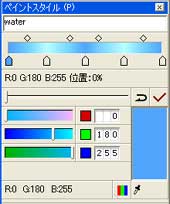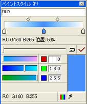 ![]() 【図37】 背景はデフォルト登録されているグラデーション【rain】の複製を利用することにします。まず複製を作成し、その複製を編集モードとしてから【図38】【図39】のカラーリングでグラデーションを作成します。 |
