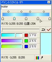 ![]() 【図38】 プロット位置は25%きざみとしました。なお、任意の位置に新しい指定位置を設定したい場合は、該当するグラデーションノードの部分をクリックすれば自動的に付加します。 |