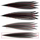 ![]() 【図17】 眉毛と鬣は全てオリジナルストロークを作成することにしました。基本的には楕円の先端のハンドルを削除して鋭角としたレンズのような図形を組み合わせたものを複数作成して画面で確認しながら調整し、最終的に絞り込んでいきます。なお、【図17】で実際に採用したのは、一番上が鬣用。一番下が眉毛用です。 |