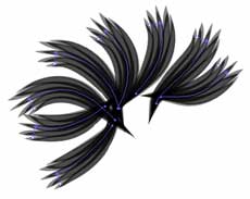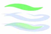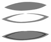 ![]() 【図18】 眉毛は単純なレンズ型のオブジェクトを50%の透明度で組み合わせたものですが、鬣は【図18】のようにレンズ型図形をスケルタルストロークとして登録後にオリジナルのレンズ型図形に対して、今作成したスケルタルストロークを指定したものを組み合わせています。【図18】は上からオリジナル図形。ストロークだけを指定した図形、塗りとストロークの両方を指定した図形。なお、鬣用のストロークは塗り、線ともにを透明度を50%に設定しています。 |