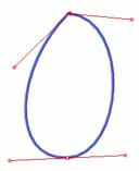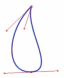 ![]() 【図12】 作図も【図11】の状態になれば完成したのも同様です。あとは【図12】のようにハンドルの片方をパスの内側に移動させれば唇になります。必要に応じてこの段階でノードを追加したり、滴の先端となる丸い部分のハンドルを調整してみましょう。 |