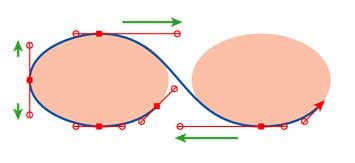 ![]() 【図04】 パスには必ずノードとハンドルが付いています。そのノードの位置を変更したり、ハンドルを移動させることでパスのカーブは大きく変化します。 |