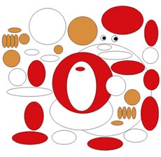 ![]() 【図03】 【図02】の楕円を組み合わせた状態です。まだ回転処理も90度きざみにしか設定していませんが、これで充分です。意外とこのように割り切った描き方でも雰囲気は出てしまうものです。後述しますが、実はこれでもうほとんど完成と言っても過言ではありません。 |